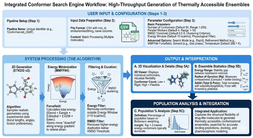 The Conformer search engine is a computational tool that delivers thermally accessible conformation ensembles that capture the structural flexibility of drug-like molecules essential for accurately binding predictions and structure activity relationship analysis. You will use this engine when you need to generate comprehensive ensembles of low-energy 3D molecular conformations for drug discovery applications like molecular docking or pharmacophore modeling. You can utilize this engine to analyze intrinsic compound conformational energies when cross referencing generated/docking ligand protein poses. Large deviations in conformation needs to be analyzed to ensure favorable energetic compositions and changes.