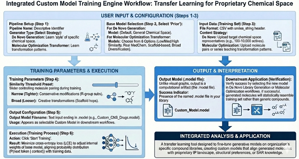 Revilico’s Custom Model Training Engine is a transfer learning tool that applies pre-trained models to your curated compound library creating custom models that generate chemistry aligned with your organization’s structural preferences. IP landscape, and SAR knowledge for downstream library generation and lead optimization campaigns. This engine is best used when you need to fine-tune the De Novo Library Generation Engine or the Molecular Optimization engine, enabling the generation of molecules that statistically resemble your training dataset rather than generic drug-like compounds.This feature helps you to establish your ‘chemical prior’ model that can be used for molecular optimization, allowing you to sample from the chemical space of your input molecular library and surrounding spaces.