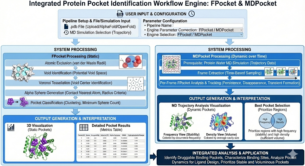 MD Pocket operates the same way as Pocket search, the difference being that it calculates the Pocket search at every frame of a MD simulation, capturing the pockets while the protein dynamically changes, compared to Pocket search which just captures the pockets at one screenshot of the protein. MDPocket reveals which pockets persist, disappear, or transiently form over time.