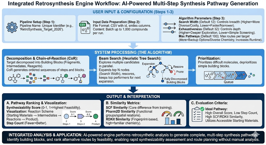 The Retrosynthesis engine is an AI powered tool that generates complete multi-step synthesis pathways, identifies required building blocks, and provides alternative routes ranked by feasibility enabling rapid route planning, synthesizability assessment, and identification of chemical analogs utilizing retrosynthetic analysis. This engine is best used when you have a target molecule and need to determine how to synthesize it from commercially available starting materials.